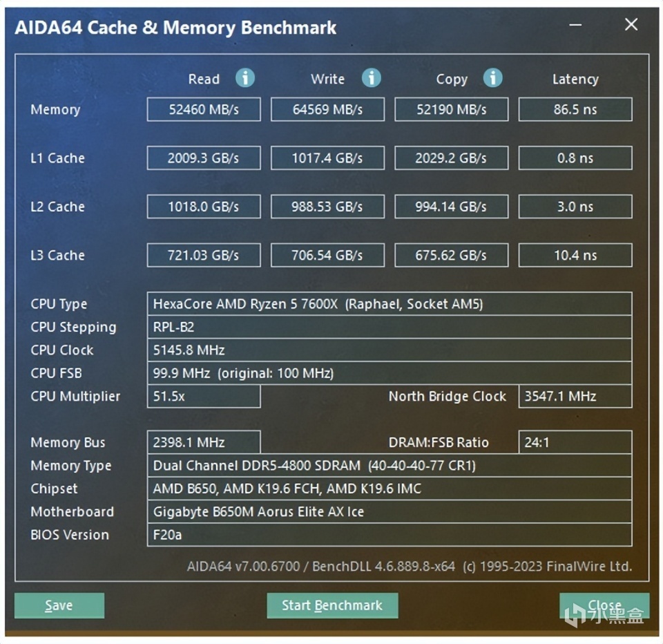 内存测试方面,默认频率4800MHz(时序40-40-40-77),读取速度为52460MB/s,写入速度为64569MB/s,复制速度为52190MB/s,延迟为86.5ns。