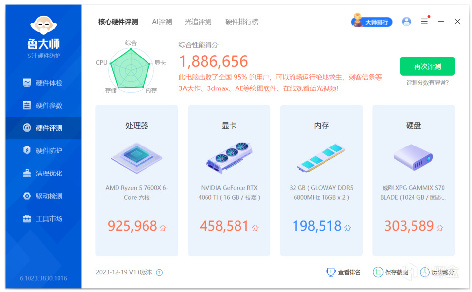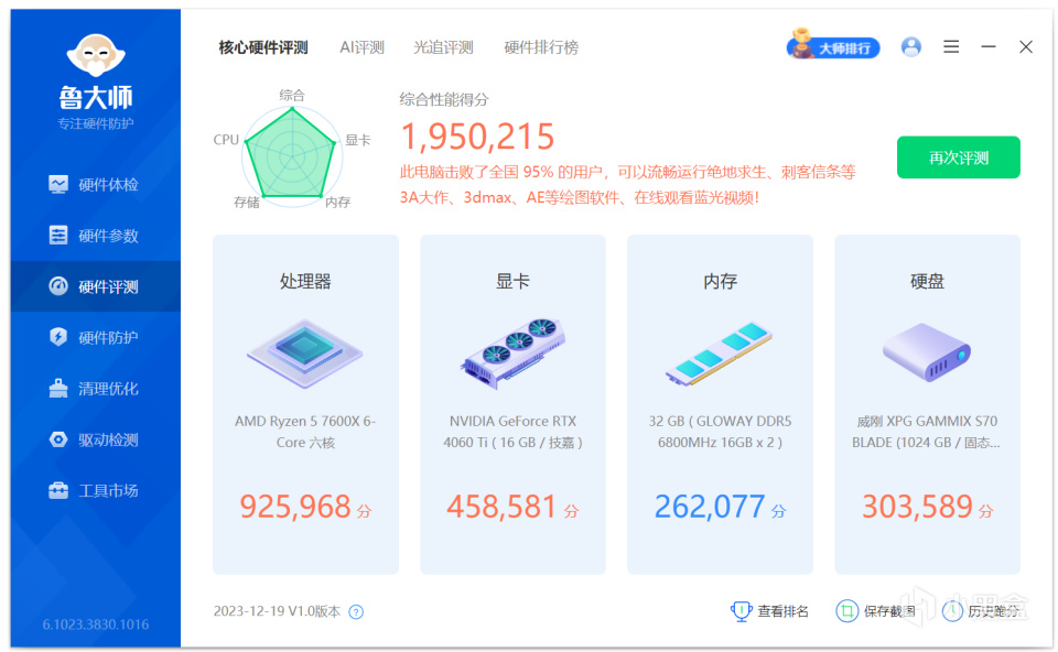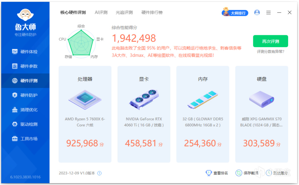 先来看看喜闻乐见的鲁大师,整机跑分大概是194.2万,其中CPU得分是92.5万,显卡得分是45.8万,内存得分(开启EXPO)是25.4万,硬盘得分为30.3万。