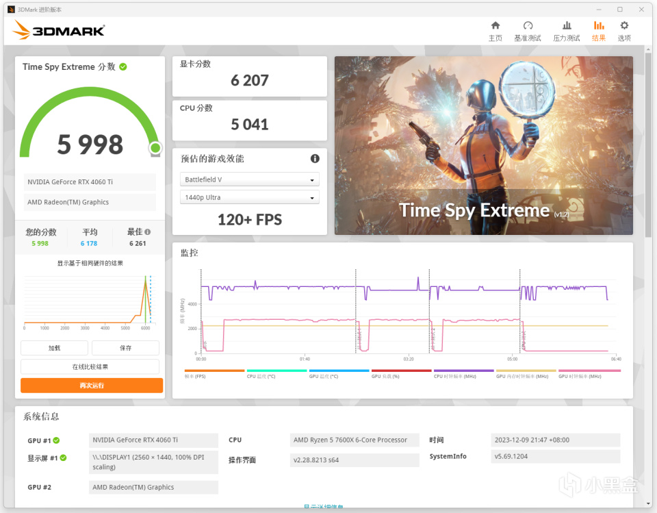 3DMARK Time Spy Extreme分数为5998,其中显卡分数为6207,CPU分数为5041。