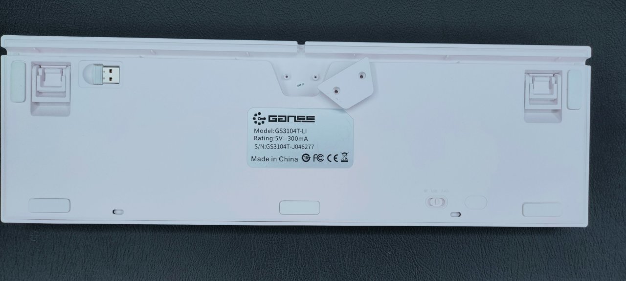 键盘的底部呢采用了二段式脚撑的设计,使用上还是较为稳固的,不会出现偏移的现象,左侧则为2.4G接收器收纳仓,平时拿取非常方便。可能还会有人问理线槽那一刻的盖子是什么?那个是出线口固定盖,可以更好地固定线材以及起到了保护的作用,右下角呢则为三模连接开关。