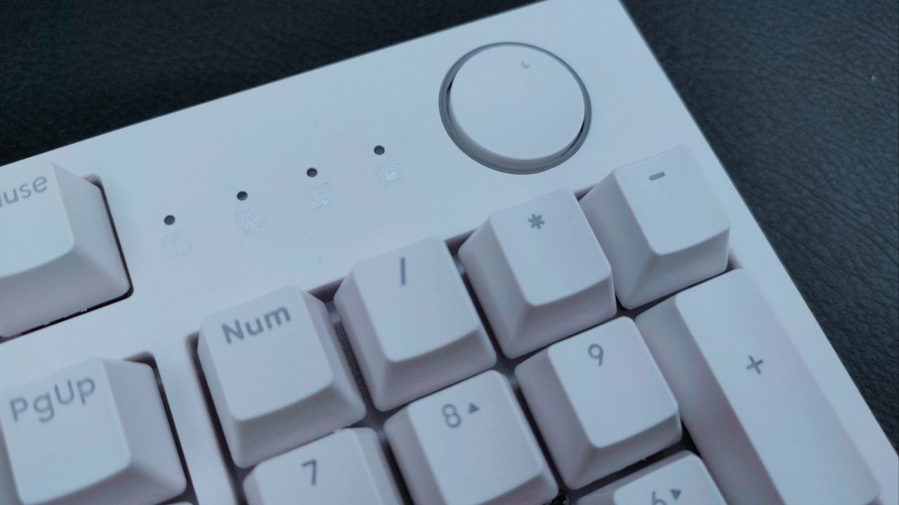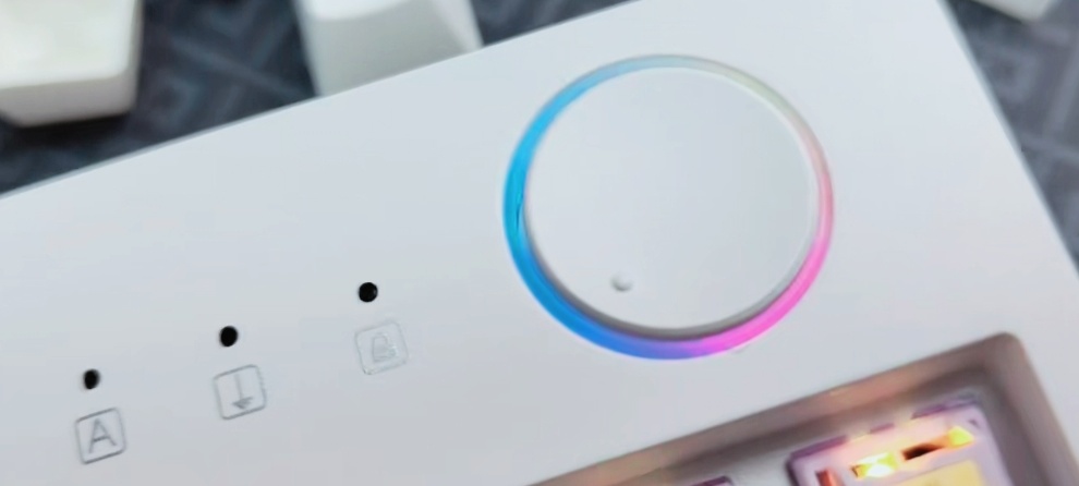 键盘的右上角呢为多媒体旋钮,可以用来调节音量并且支持一键静音功能,与其他品牌不同的是他们点旋钮都是凸起的,而高斯则是略微下陷的设计,且观感上更加圆润,使用起来也是意外的顺滑,且值得一提的是旋钮旁边还有着灯带的设计,在开灯的情况下,颜值可以说是很高的了