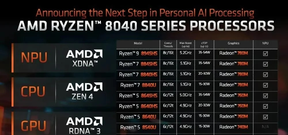 AMD仅仅是调整了部分产品的能耗区间——R7-8840HS、R5-8640HS处理器的cTDP(可配置功耗) 如今被下调至20-30W。而R7-8845HS、R5-8645HS处理器 则依然维持了现有的35-54W标压水准。在未来的选购中,要尤其留心这些差异。