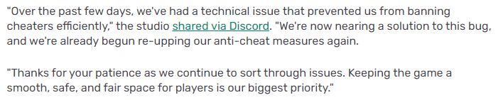 “在过去的几天里,我们遇到了一个技术问题,导致我们无法有效地禁止作弊者,”该工作室通过 Discord 分享道,“我们现在已经接近解决这个 bug 了,我们已经开始再次更新我们的反作弊措施。感谢玩家在我们持续解决问题时的耐心等待!为玩家保持游戏流畅、安全和公平的空间是我们的首要任务。”