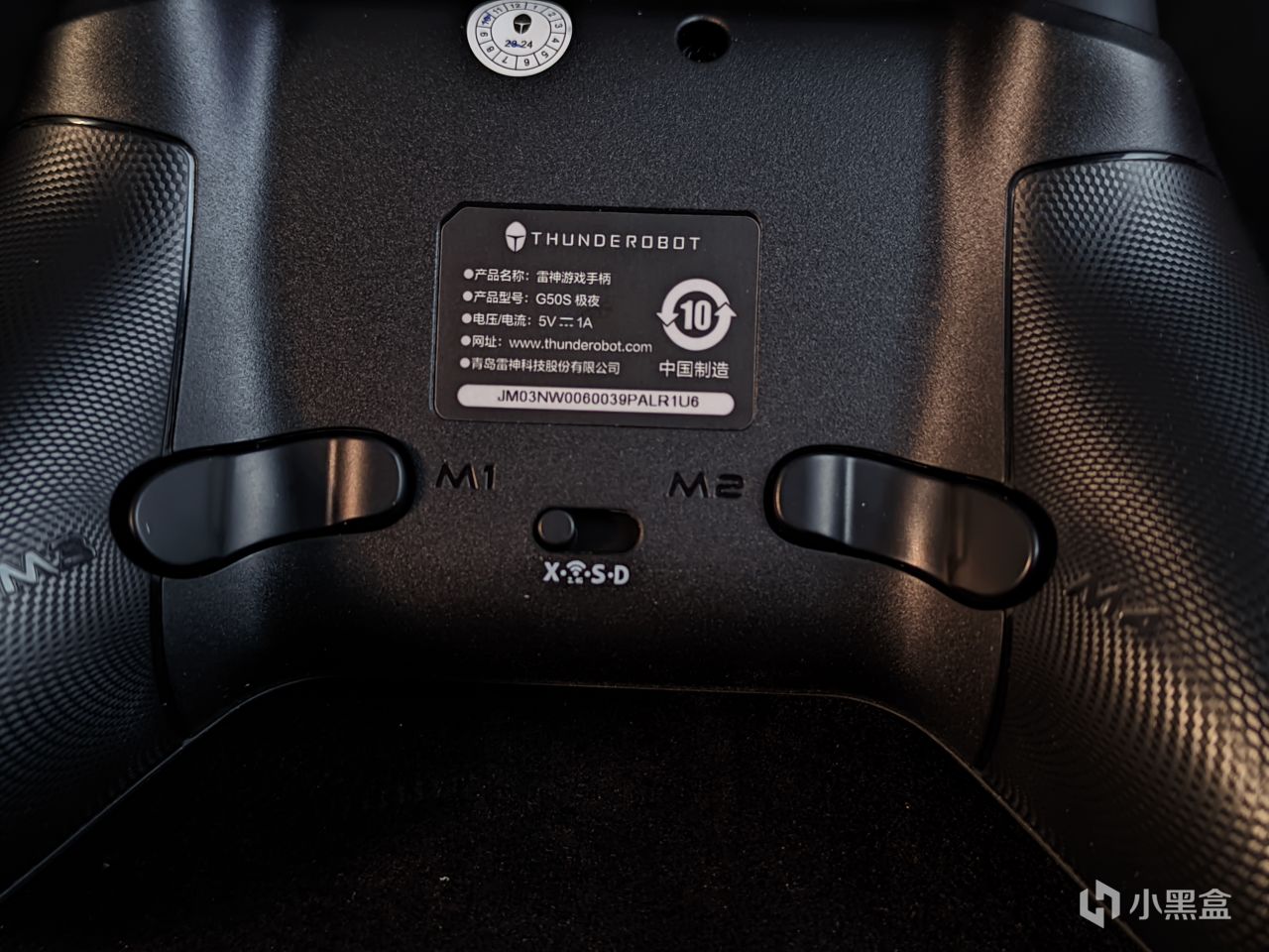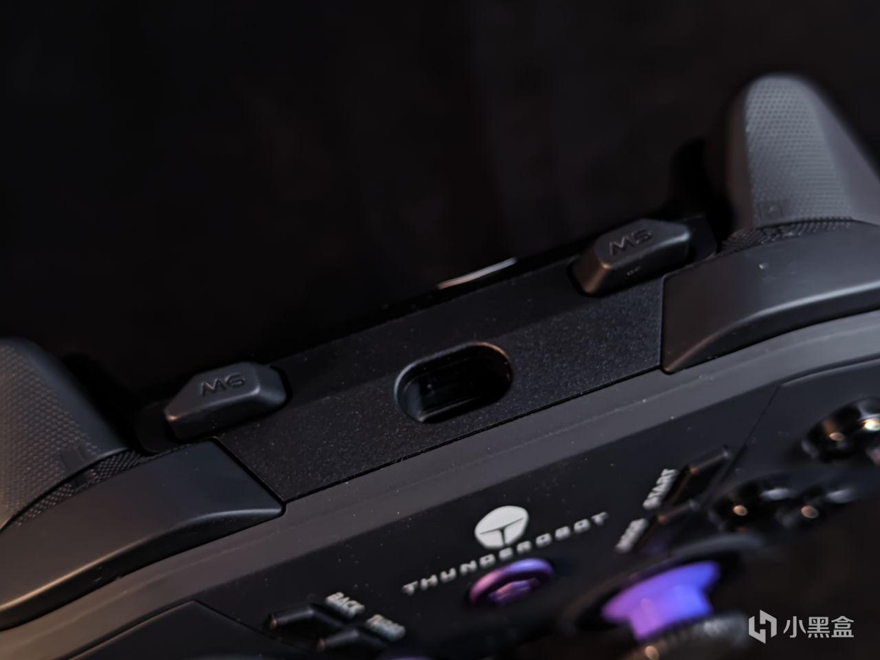 手柄上方是一个霍尔扳机,一个阿尔卑斯肩键,两个可自定义宏按键,以及C口的连接口,就是这个C口需要注意,其本身设计的很深,正常的数据线是可以插入的,但是可能比较紧,而那种弯头的电竞数据线,就没办法插入到位了,这或许是出于防止接触不良以及不小心让线材掉落的考量,所以如果只有弯头线的话,就使用自带的数据线吧。