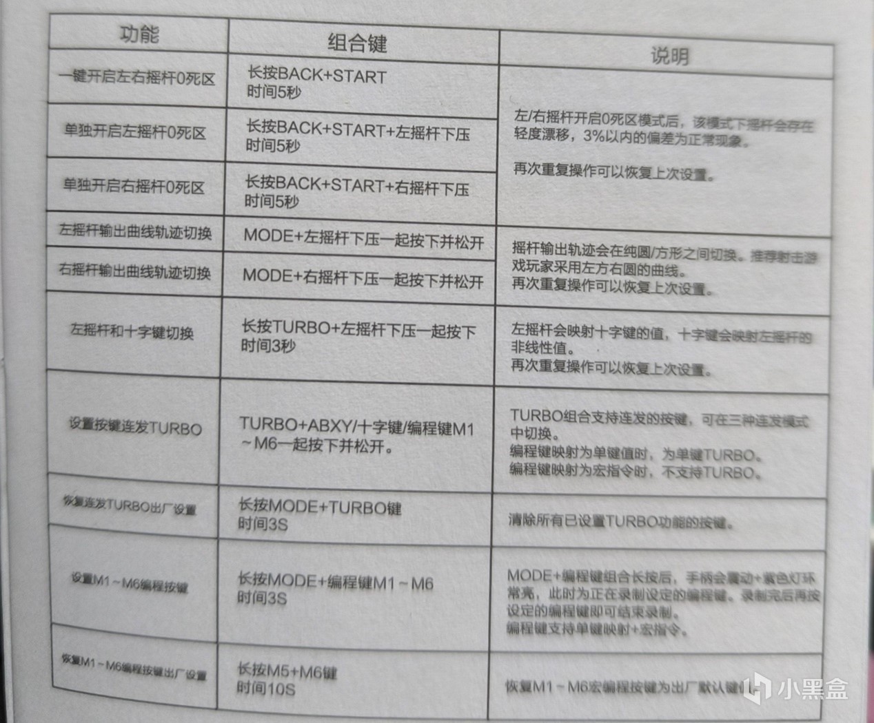 兴致勃勃的打开盒子,发现似乎不对劲,去查看了一下详情页,嗯,只有黑白二色,所以,紫色是你的谎言吗?不过黑色款还蛮帅的,就不多计较了吧,手柄本身的功能键非常多,足足有着6枚之多,不过排布的还算合理,看着也不是那么杂乱。