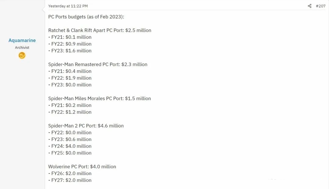 Install Base論壇用戶Aquamarine發佈消息稱,在針對Insomniac的勒索軟件攻擊後泄露到網上的一份機密文件中,詳細列出了該工作室已發售遊戲和未來遊戲PC移植版本的預算。《漫威蜘蛛俠2》的PC移植成本將達到460萬美元,是第一部作品的兩倍,將在2024財年完成開發,這意味着將在 2024年3月之後發售。考慮到Insomniac將爲PC玩家提供完整體驗,該移植版可能將在PS5所有DLC上線之後推出。雖然即將面世的《漫威蜘蛛俠2》PC移植版會成爲Insomniac最昂貴的移植作品,但預計2027財年推出的《漫威蜘蛛俠3》PC移植版將以700萬美元的成本超越它。