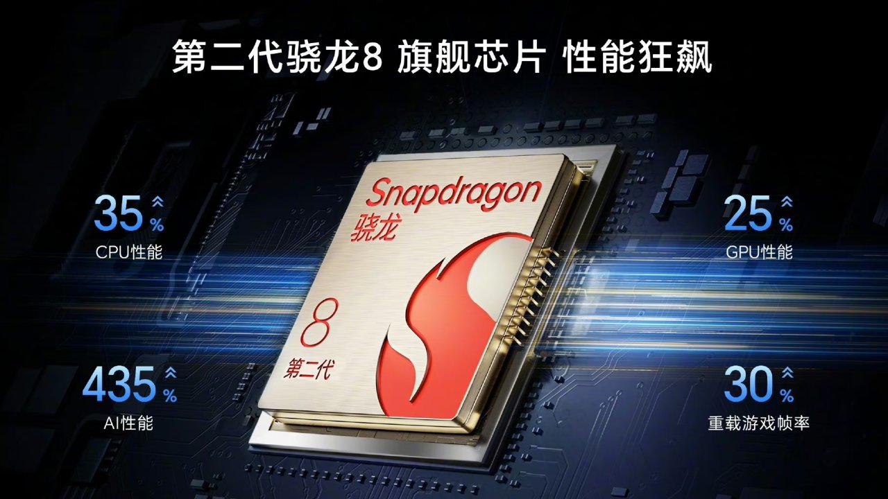 搭载高通骁龙 8 Gen 2芯片,配备LPDDR5X 内存,UFS 4.0 闪存,超帧独显芯片,5268mm² VC均热片,自研射频增强芯片 C1。