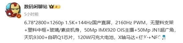 ◆ 屏幕:6.78 英寸 2800×1260p•1.5K国产直屏,支持144Hz高刷,2160Hz PWM 高频调光;