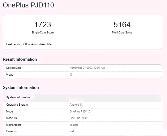 ◇ 一加 Ace 3 此前已(型号:PJD110)现身 Geekbench6.2.0 跑分平台。
