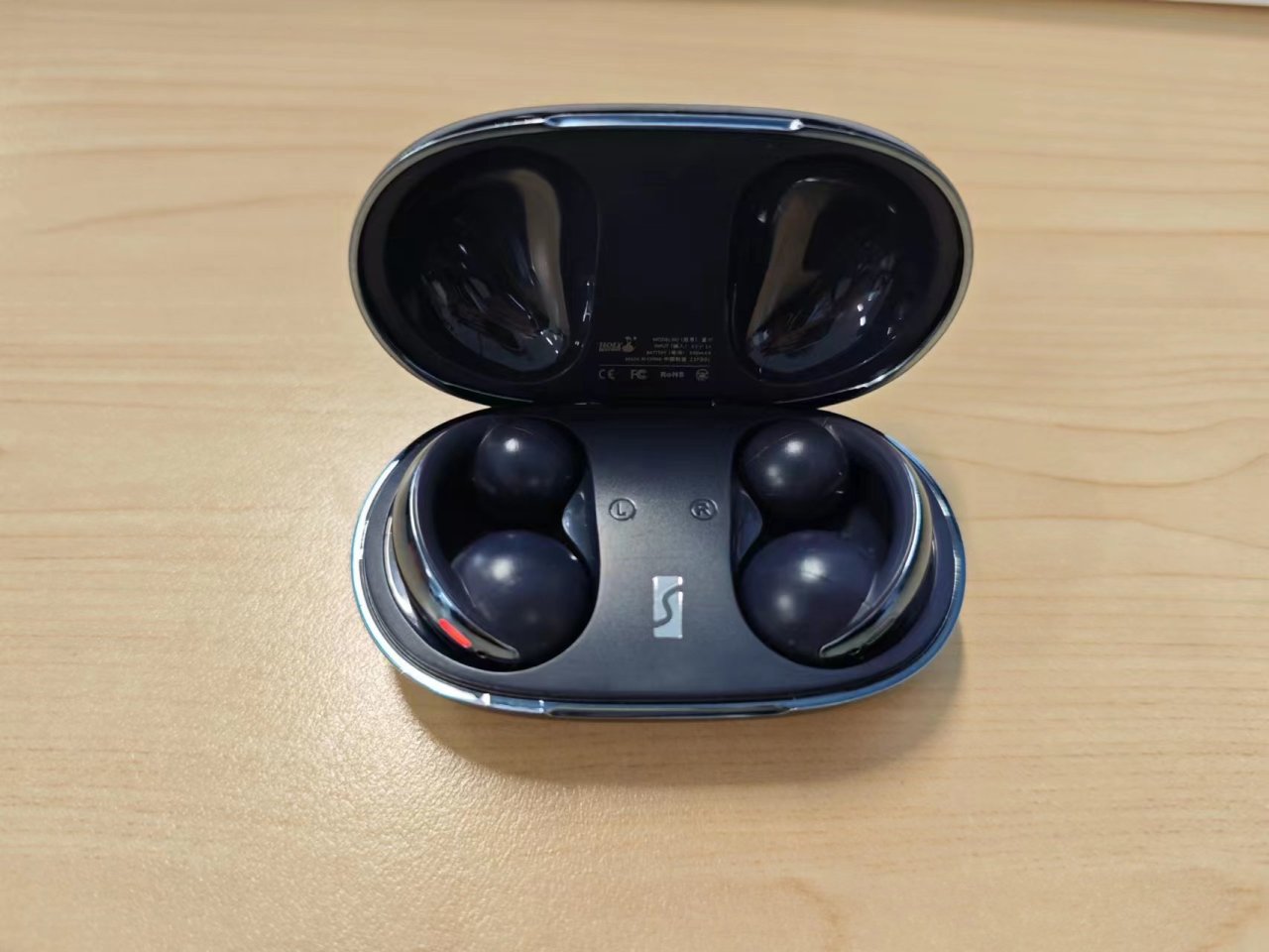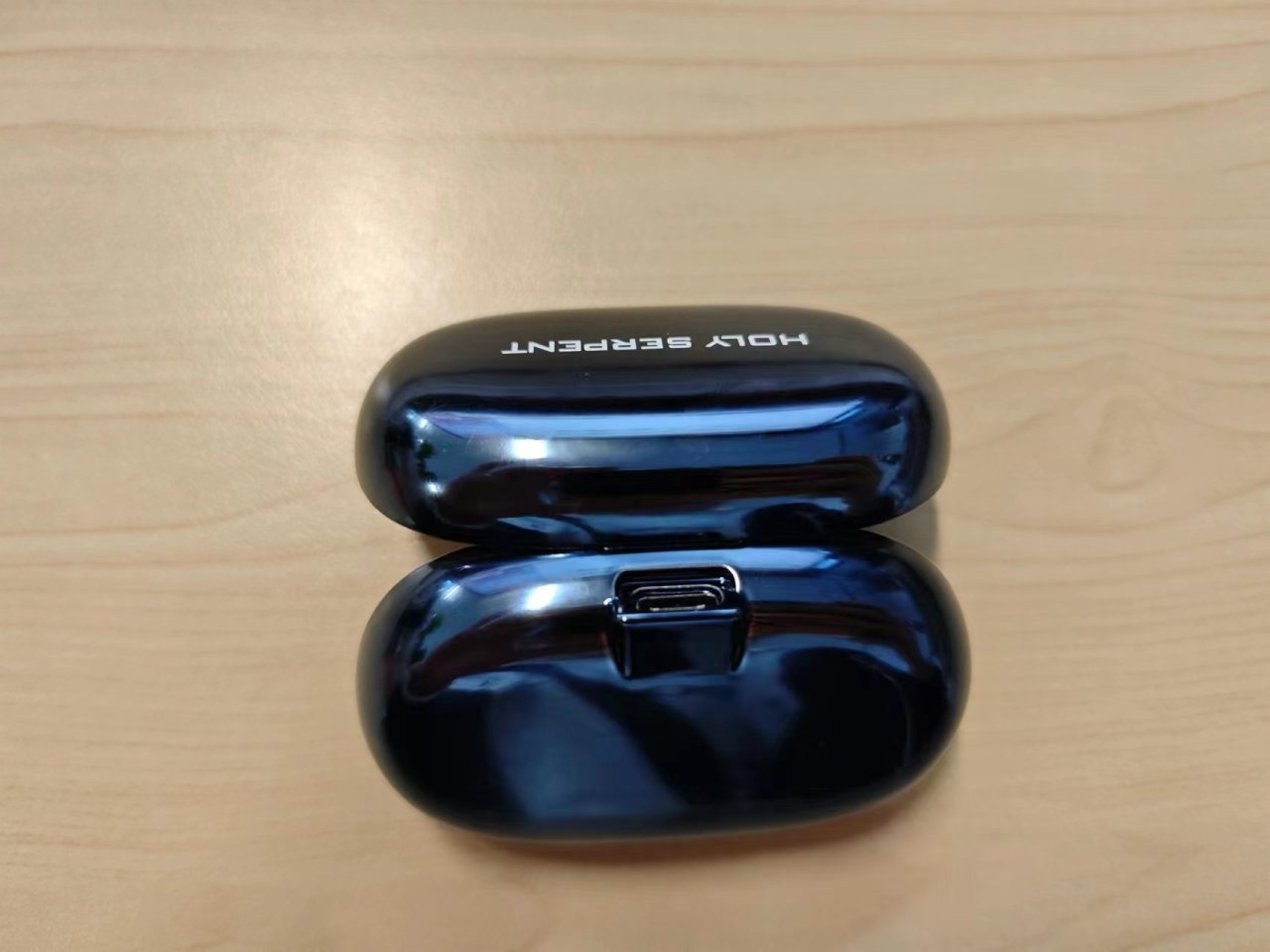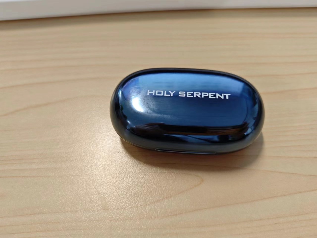 耳机仓是深蓝色主题,外表光滑圆润,流光的质感。表面有一层反光层,甚至可以用背面照镜子,不过会显得脸的很大是了。
