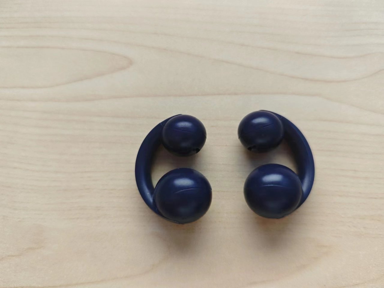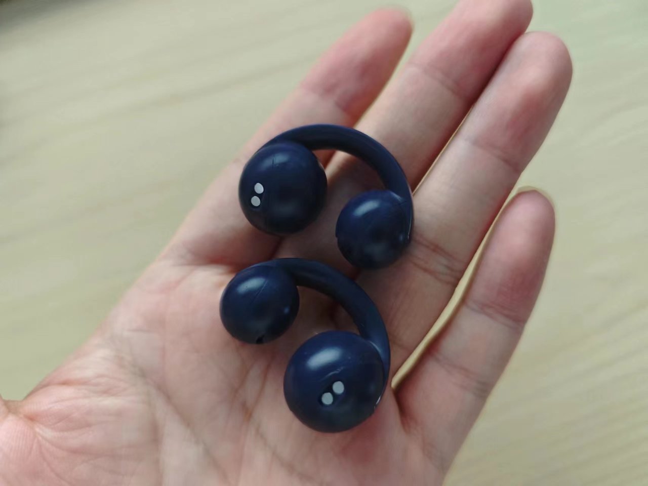 耳机有2个球体和连接带组成,小球是发声区,大球是功能区,大球侧面还附带触控功能。连接处有个灯,显示充电、等待连接等状态。