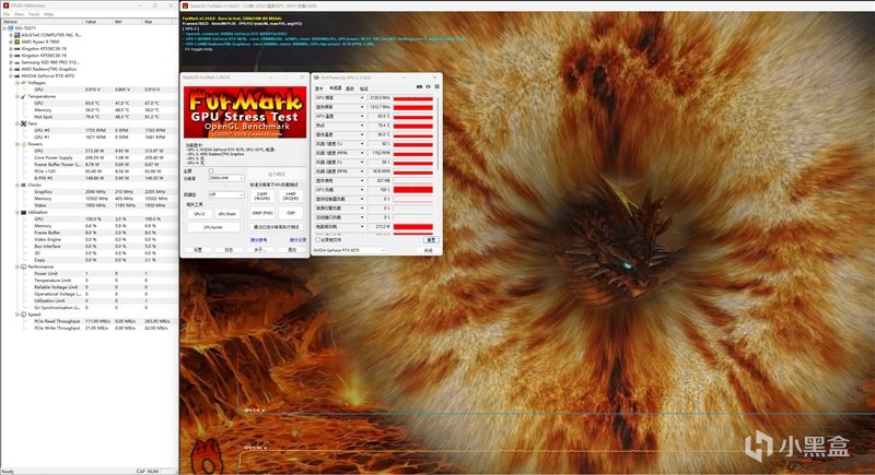 重新使用FurMark进行烤机10分钟,此时影驰20周年RTX 4070显卡的GPU频率在2040MHz,最大频率可到2325MHz,215W的功耗、温度65℃、1691~1773的风扇转速,超频前没有太明显的变化。