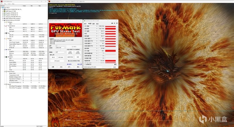 此轮对影驰20周年RTX 4070显卡的P-Mode下进行烤机,将FurMark的参数设定为2K分辨率+关闭抗锯齿。