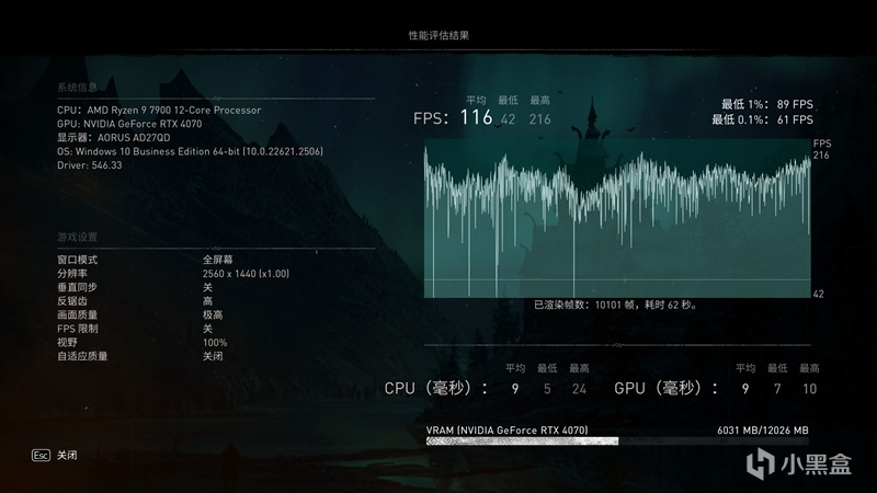 在《刺客信条:英灵殿》2K+预设极高画质下,平均帧数为116 FPS。