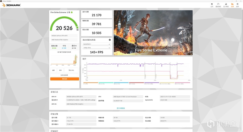在3DMark的Fire Strike Extreme(DX11+2K渲染分辨率)测试中,总成绩为20526,其中影驰20周年RTX 4070显卡的分数为21170。