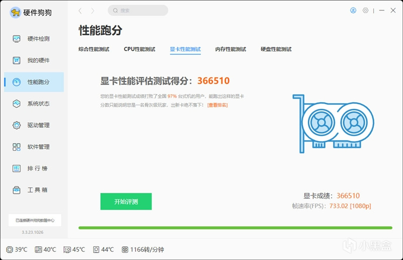 硬件狗狗对给出了366510分的成绩,领先了97%台式机用户,给出的评价是骨灰级玩家才能拥有的显卡。