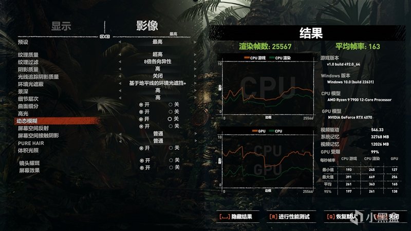 在《古墓丽影:暗影》2K+预设最高画质+DX12,平均帧数为163 FPS。