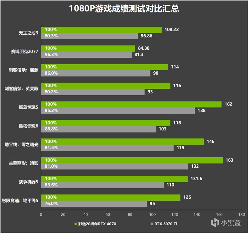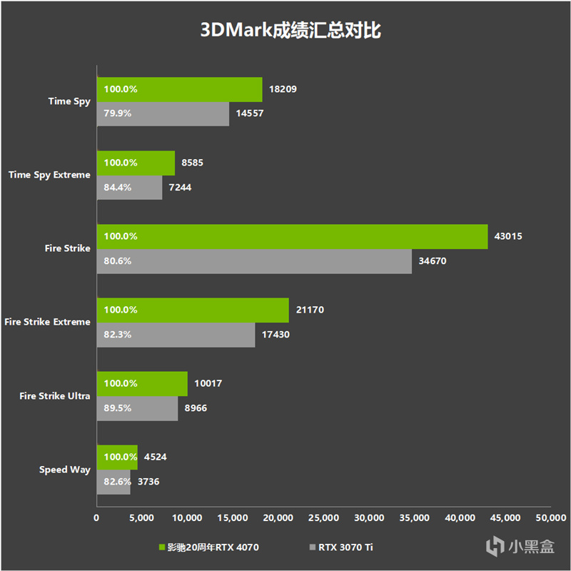 对比上代RTX 3070 Ti,影驰20周年 GeForce RTX 4070显卡的性能提升非常明显,整体性能增幅约20%。