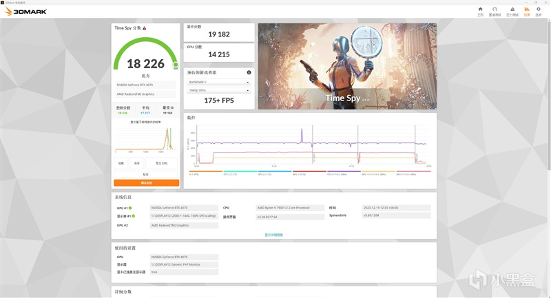 重新进行Time Spy测试,超频后影驰20周年RTX 4070显卡分数来到了19182,比起默频下的18209的成绩,提升了973分,幅度约5.3%。