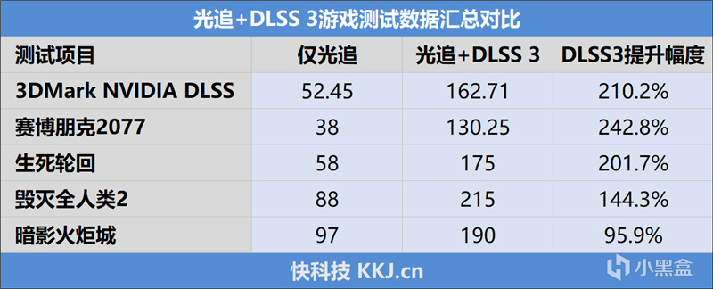 在开启光追+DLSS 3后,所有的游戏都得到了至少翻倍的性能提升,尤其是《赛博朋克2077》是测试项目中提升幅度最高的,达到了2.4倍。