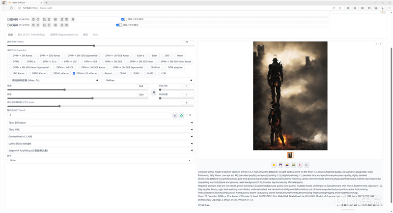 在测试时,我们的采样方法选择DPM++ 2S a Karras,迭代步数为70,图片宽度和高度为854×1264。