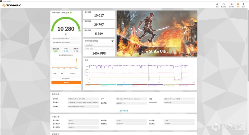 在3DMark的Fire Strike Ultra(DX11+4K渲染分辨率)测试中,总成绩为10280,其中影驰20周年RTX 4070显卡的分数为10017。
