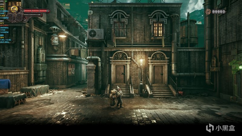 在2K分辨率+预设最高画质+开启光追,当前游戏画面帧率为105 FPS;