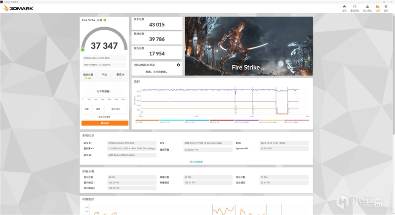 在3DMark的Fire Strike(DX11+1080P渲染分辨率)测试中,总成绩为37347,其中影驰20周年RTX 4070显卡的分数为43015。
