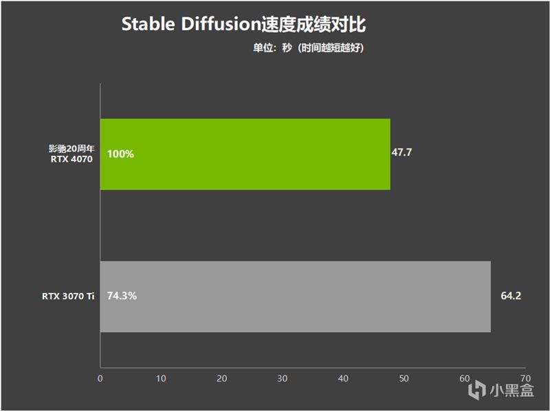 比起RTX 3070 Ti的64.2秒,影驰20周年RTX 4070显卡只需用时47.7秒就完成了渲染,也就是说速度要快了35%,对于有AI制图需求的用户,40系显卡显然更具有优势。