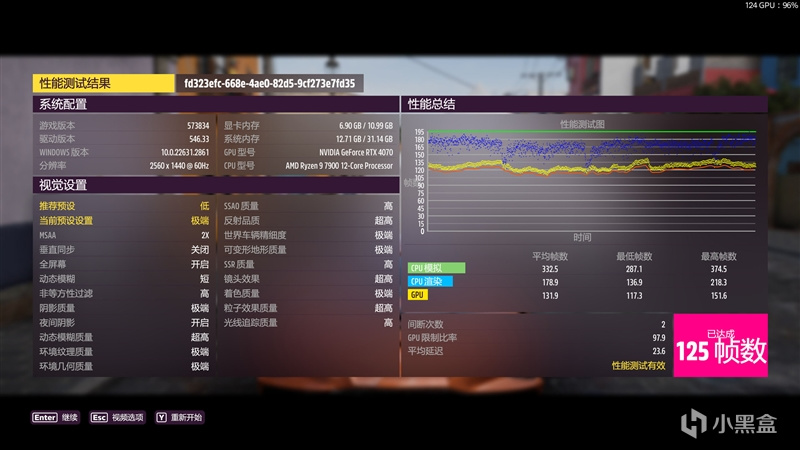 在《极限竞速:地平线5》2K+极端画质下,平均帧数为125 FPS。