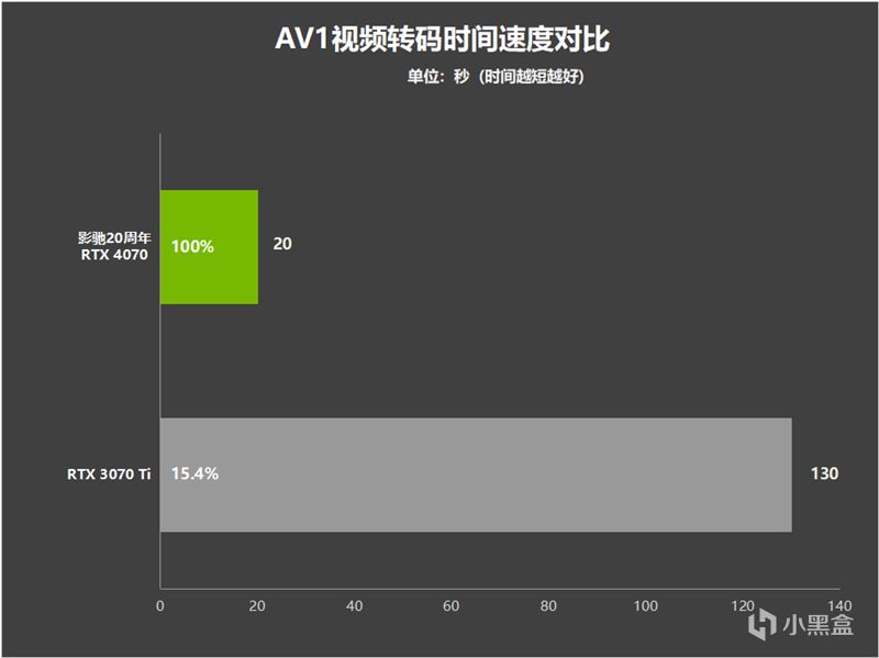 加入了AV1编码支持的影驰20周年RTX 4070显卡,只需要20秒就转码完成了,效率是RTX 4070 Ti的至少5倍以上,带来的生产力体验提升非常可观。