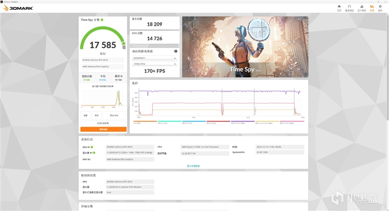 在3DMark的Time Spy(DX12+2K渲染分辨率)测试中,总成绩为17585,其中影驰20周年RTX 4070显卡的分数为18209。