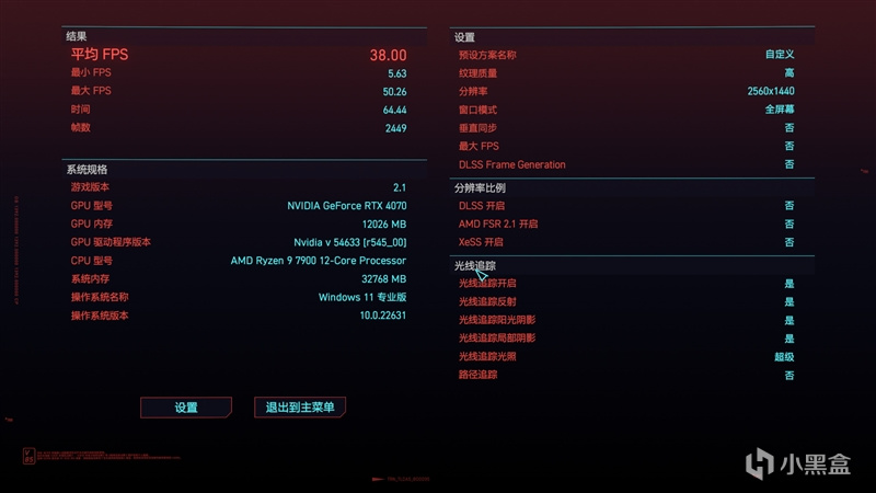在《赛博朋克2077》在2K分辨率+预设超级光线追踪的基础上,仅开启光追并关闭DLSS,测得平均帧率为38 FPS。