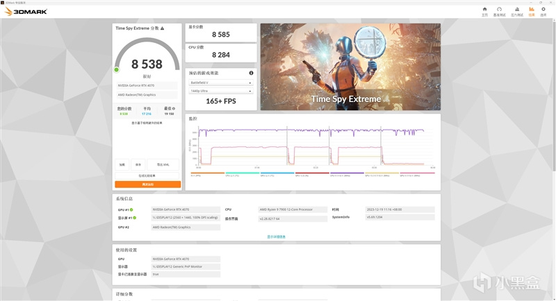在3DMark的Time Spy Extreme(DX12+4K渲染分辨率)测试中,总成绩为8538,其中影驰20周年RTX 4070显卡的分数为8585。