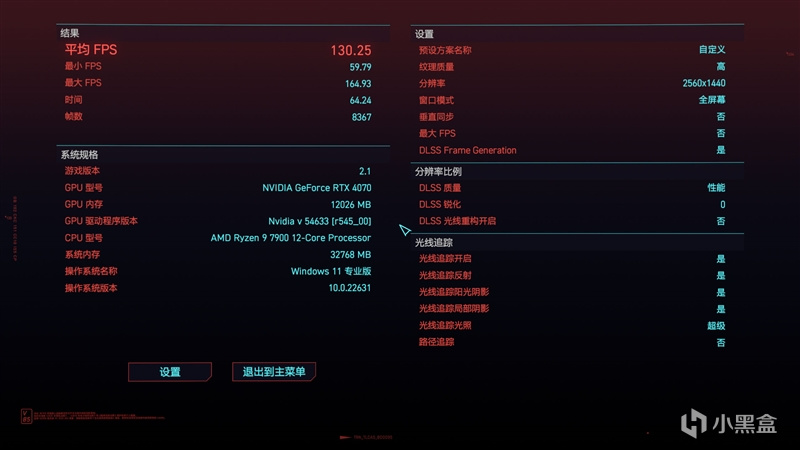 在《赛博朋克2077》2K+预设超级画质下,平均帧数为84.38 FPS。