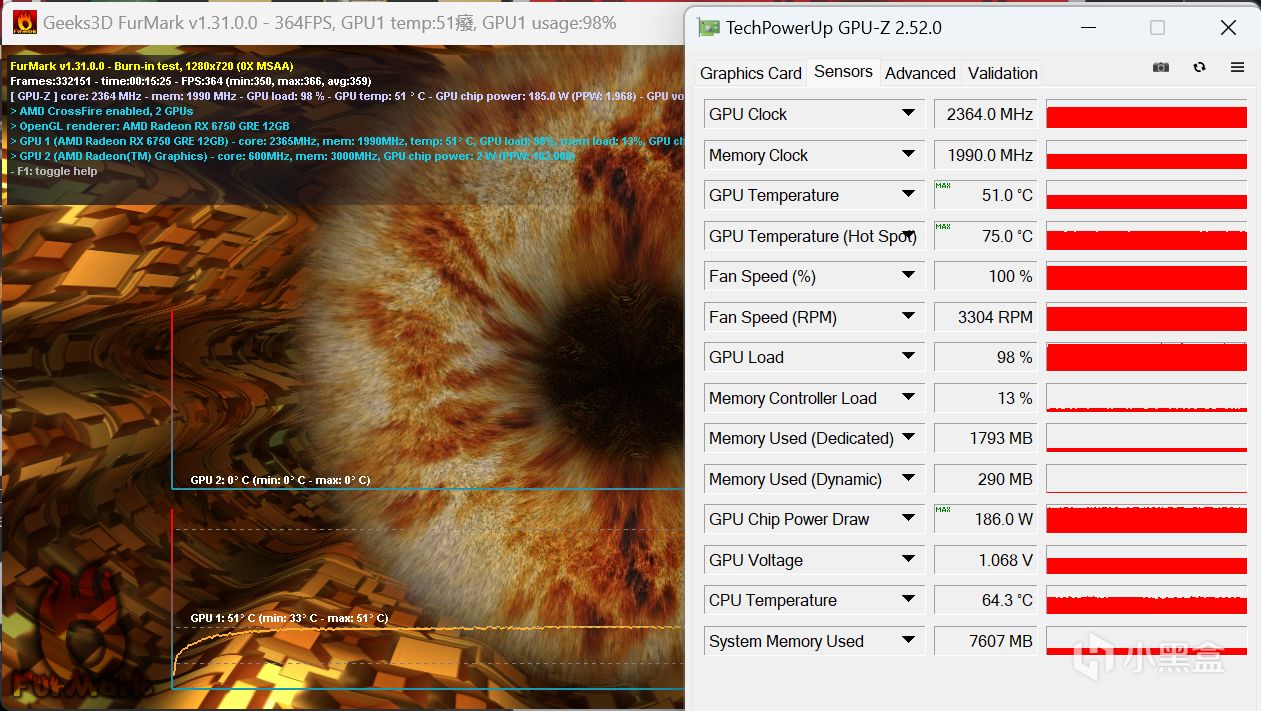 在溫度和功耗測試部分,我們在23℃的測試環境中,使用Furmark連續考機30分鐘。在默認狀態下,藍寶石RX 6750 GRE 12G D6極地版的最高溫度爲68℃,此時顯卡的風扇轉速只有1305RPM,幾乎聽不到風噪聲,靜音表現優秀。