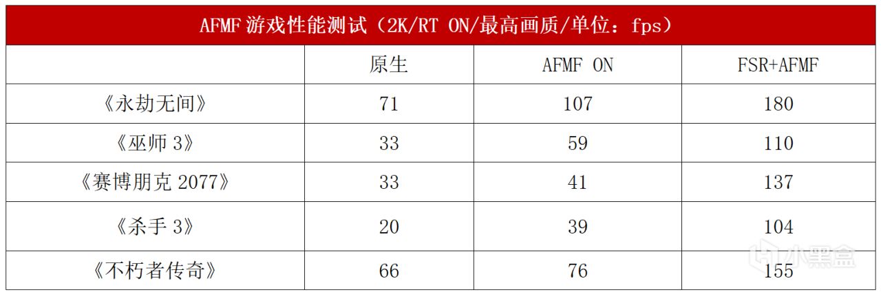 從測試的結果可以看到,在單獨開啓AFMF的情況下,對遊戲幀率的提升就比較明顯了,最高提升了95%,平均提升幅度達到53%,由於最高畫質原生分辨率下的幀率過低,最終只有3款遊戲達到流暢水平。AFMF功能配合FSR時的情況就完全不一樣了,參測的5款遊戲在開啓FSR+AFMF的情況下,幀率全部突破100fps,提升最大的《殺手3》從原生分辨率的20fps暴漲至104fps,提升高達420%,平均幀率提升達到251%。其中《不朽者傳奇》採用FSR 3關閉幀生成+AFMF的方案進行測試,甚至超過了FSR 3開啓幀生成時的幀率。