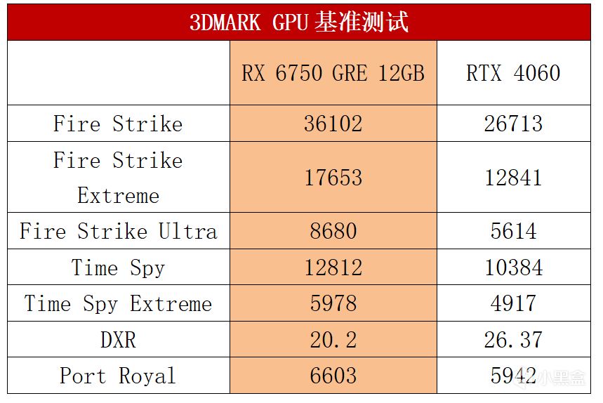 在3DMARK基準測試中,我們可以看到在A卡的傳統優勢項目FireStrike系列中,藍寶石RX 6750 GRE 12G D6極地版有很明顯的優勢,其中在4K分辨率的FireStrike Ultra,領先幅度達到了55%,在2K分辨率的Fire Strike Extreme中,也有37%的領先優勢。DX12的Time Spy測試項裏,RX 6750 GRE 12GB對比RTX 4060的領先幅度就沒有這麼誇張了,Time Spy和Time Spy Extreme項目中分別比RTX 4060強了23%和22%,依然保持了不小的優勢。在針對光線追蹤的DXR測試中,RX 6750 GRE 12GB落後RTX 4060 23%,但在Port Royal測試中,RX 6750 GRE 12GB實現了反超。