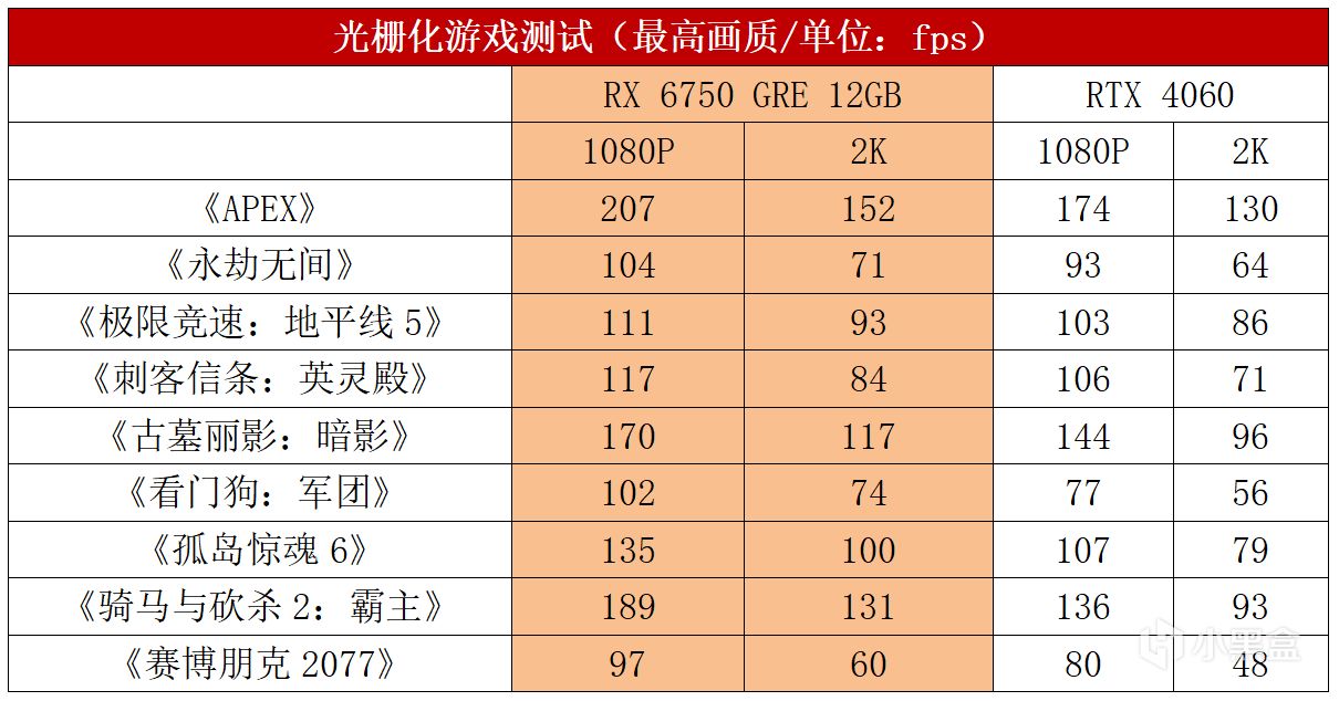 我們先來看看1080P遊戲的表現,從測試成績中可以看到,藍寶石RX 6750 GRE 12G D6極地版在1080P分辨率下對比RTX 4060有着很明顯的領先的優勢,其中《看門狗:軍團》《騎馬與砍殺2:霸主》的幀率分別比RTX 4060高32%、39%,平均領先RTX 4060 21%。而在2K分辨率下,RX 6750 GRE 12GB和RTX 4060的幀率差距進一步拉大,《騎馬與砍殺2:霸主》的領先幅度達到了41%,平均領先RTX 4060 22%。