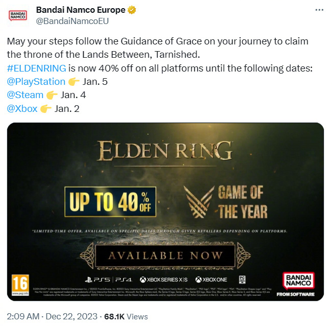 万达南梦宫今日宣布:由FS社开发、荣获2022年TGA年度游戏的角色扮演游戏《艾尔登法环》现已在所有已登陆平台上开启了-40%OFF的新史低促销!