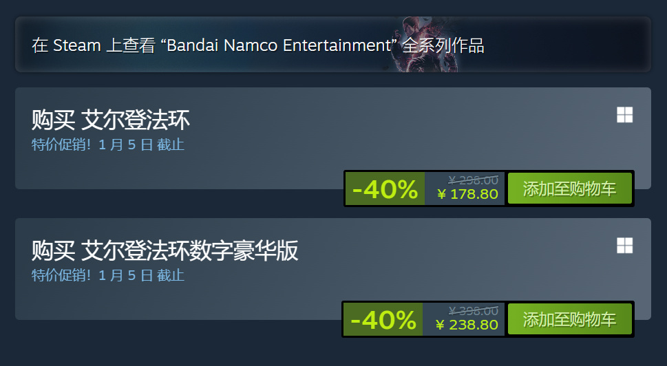 - Steam: 1月5日截止;国区标准版178.8元、豪华版238.8元