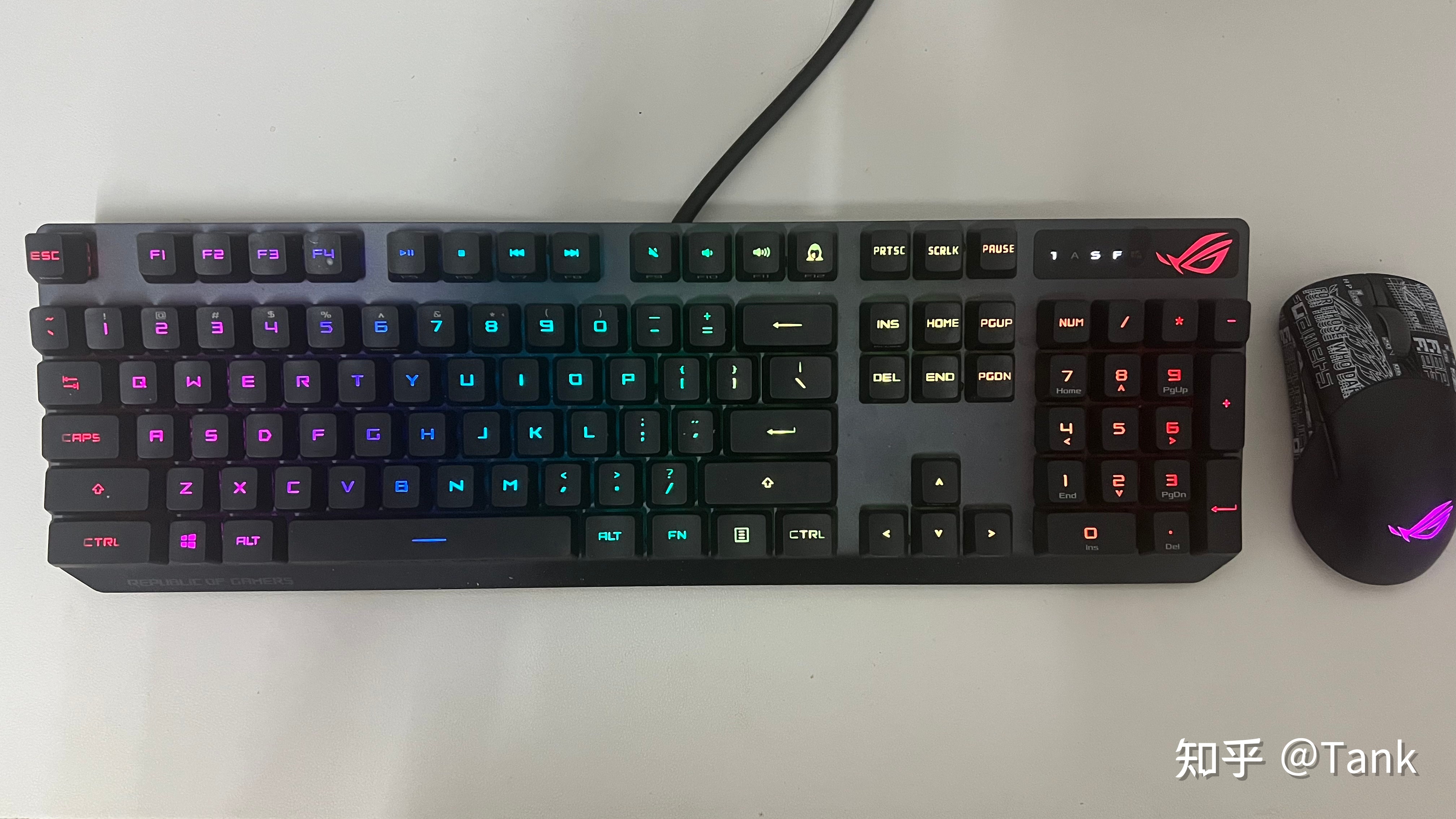 我自己手上这款是蓝轴的,类似 Box 白的轻压力段落轴,敲击起来非常带感,反馈十足,女生用也不会觉得累,我的这把键盘现在就是在给我女朋友用着,给她配的鼠标也是 ROG 月刃,适合中小手用。