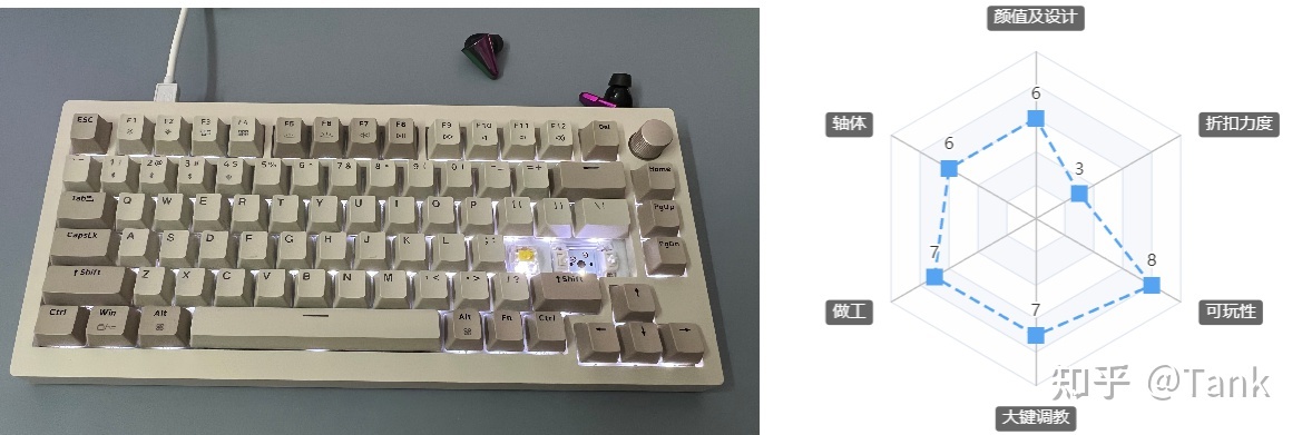 - 【颜值及设计】会从键盘外观创意设计、键帽颜值方面进行评分;