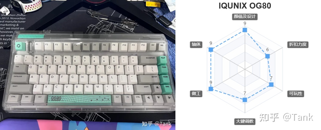 以铝厂 OG80 为例,我会从【颜值及设计】、【轴体】、【做工】、【大键调教】、【可玩性】、【折扣力度】这 6 个角度对一款键盘进行评分,满分是 10 分。