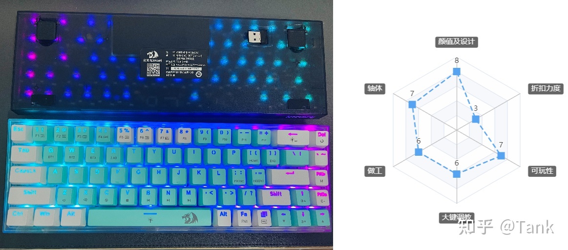 - 【可玩性】代表键盘后续可玩性,从热插拔、驱动、RGB音乐律动、小显示屏等方面打分;