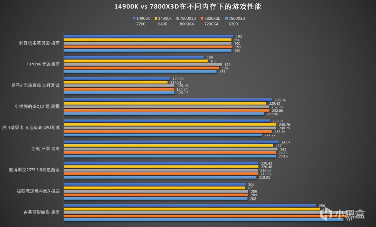 平台成本上,考虑到不同游戏类型,如果是正中7800X3D的好球区,例如FPS、网游等等,那么成本优势非常明显:毕竟7800X3D只需要普通的DDR5 6000内存、百元级散热、普通B650主板就可以完全发挥出性能,再加上CPU上的差价,足以将显卡升级1~2个档次了,这才是“小钱办大事”的精髓所在!——当然,土豪随意!