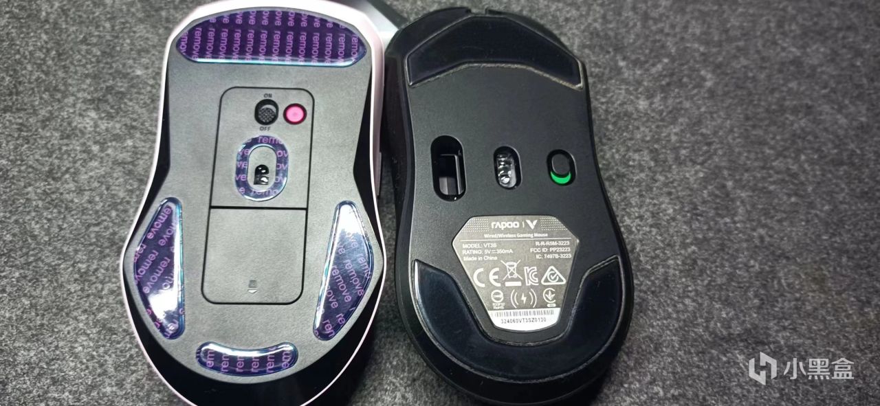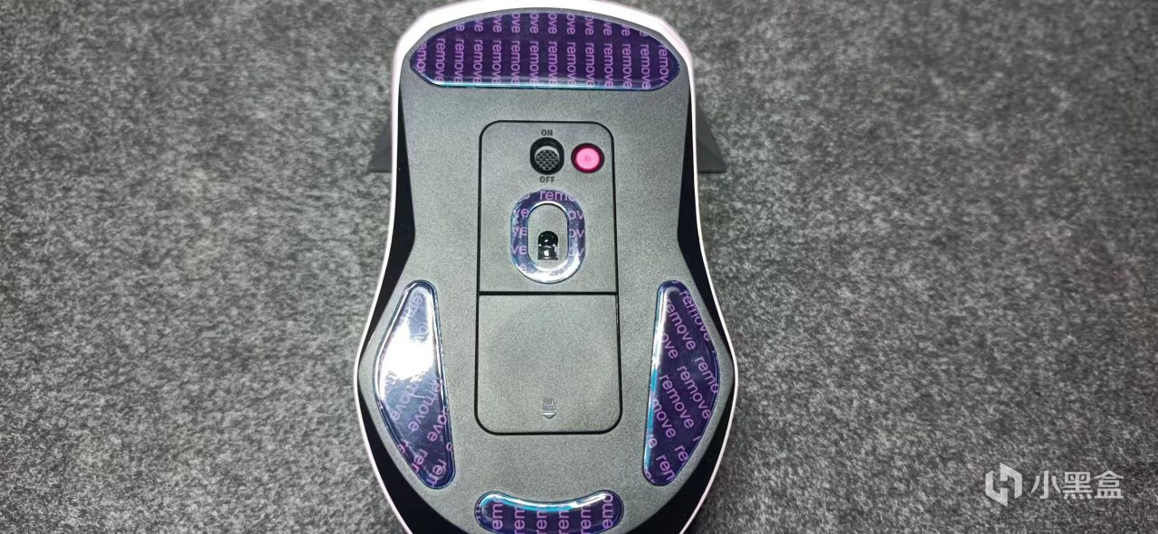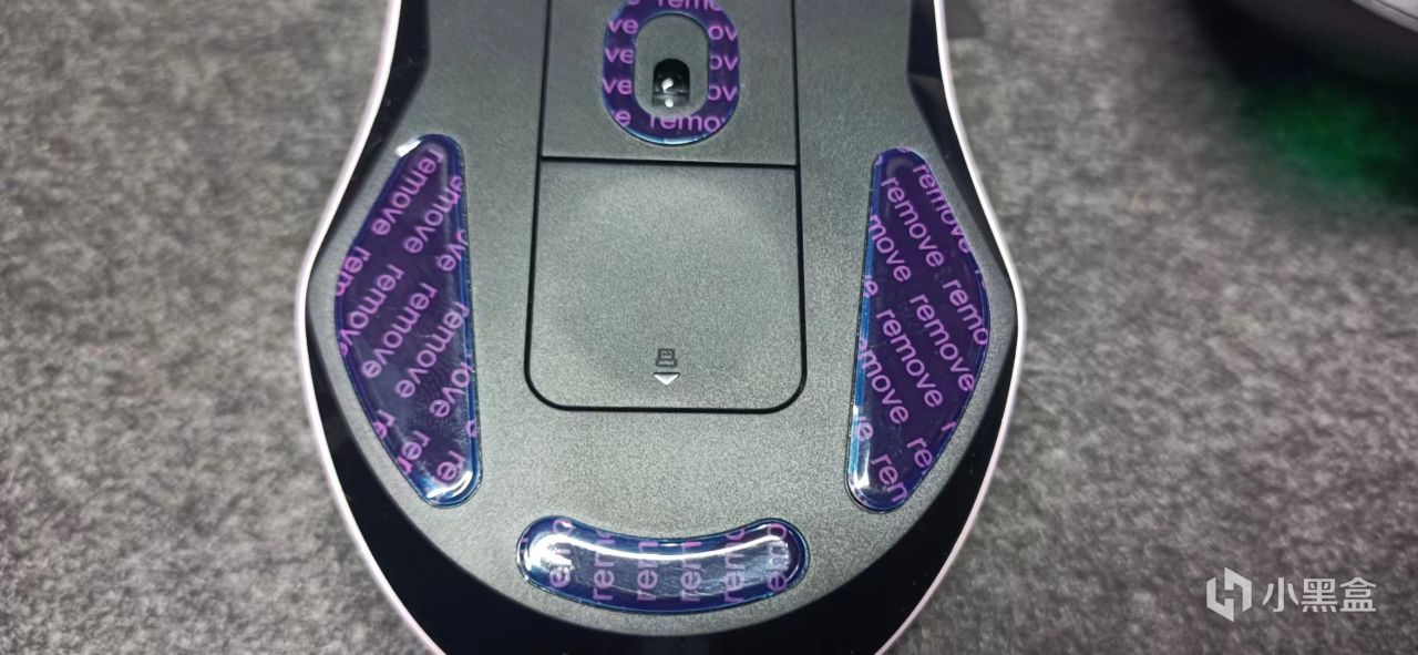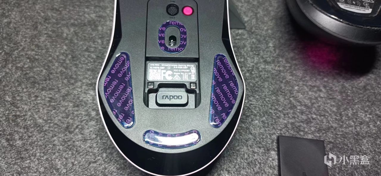 鼠标底部有四个脚贴位置,撕下防护膜之后其实不加保护膜脚贴比较容易挂花。四个脚贴肯定鼠标稳定性会不错,但是会牺牲一定的顺滑度,相对接触面积多了。雷柏VTS3就只有两个脚贴比他顺滑。
