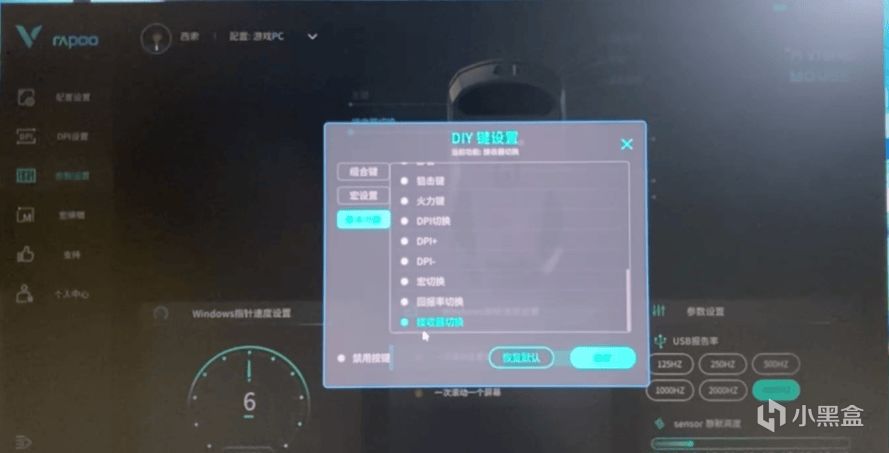鼠标底部有个开关键和一个自定义按键,出场默认DPI切换。因为在底部,且没有必要的基础功能,所以自定义的自由度更高,并且防误触。我比较喜欢“接收器切换”功能,那么1k还是4k的接收器都可以随时切换。