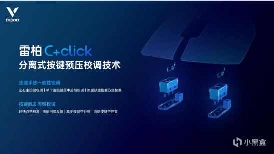 主按键的触发力度和触发行程都相当不错,没有明显停顿感,手感可能偏软,但是也比较清脆。据了解,这次的雷柏VT9PRO的主按键是采用了C+click分离式按键预压校调技术。