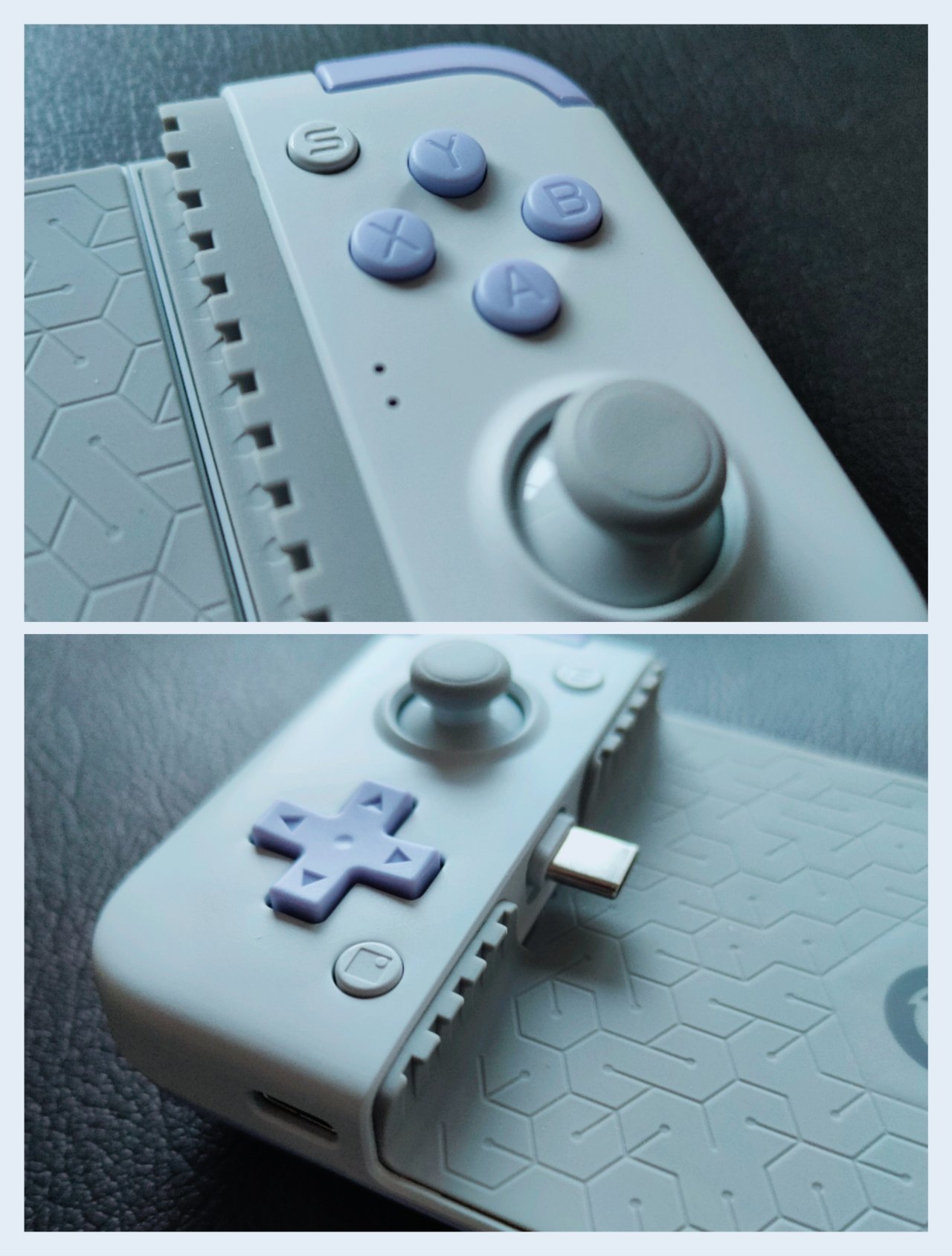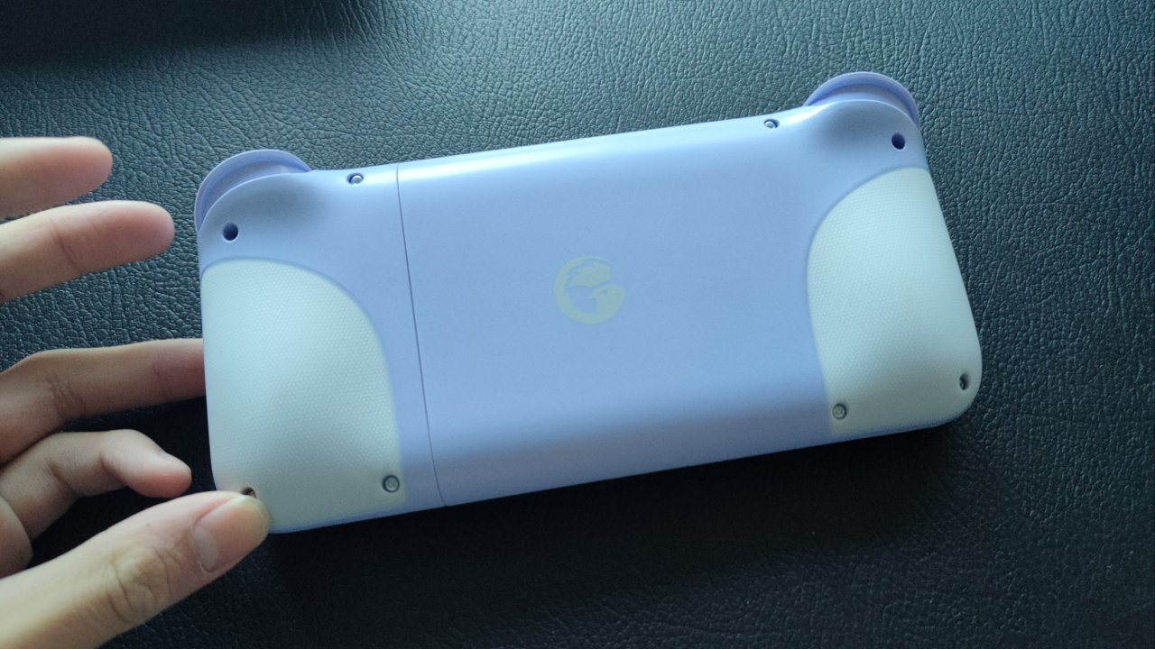 手柄的背面呢整体以紫色为主,颜值很高。底壳的握把方面采用了双色包胶设计,整体的握把舒适度很高,且防手汗,对于我这种汗手来说非常友好。